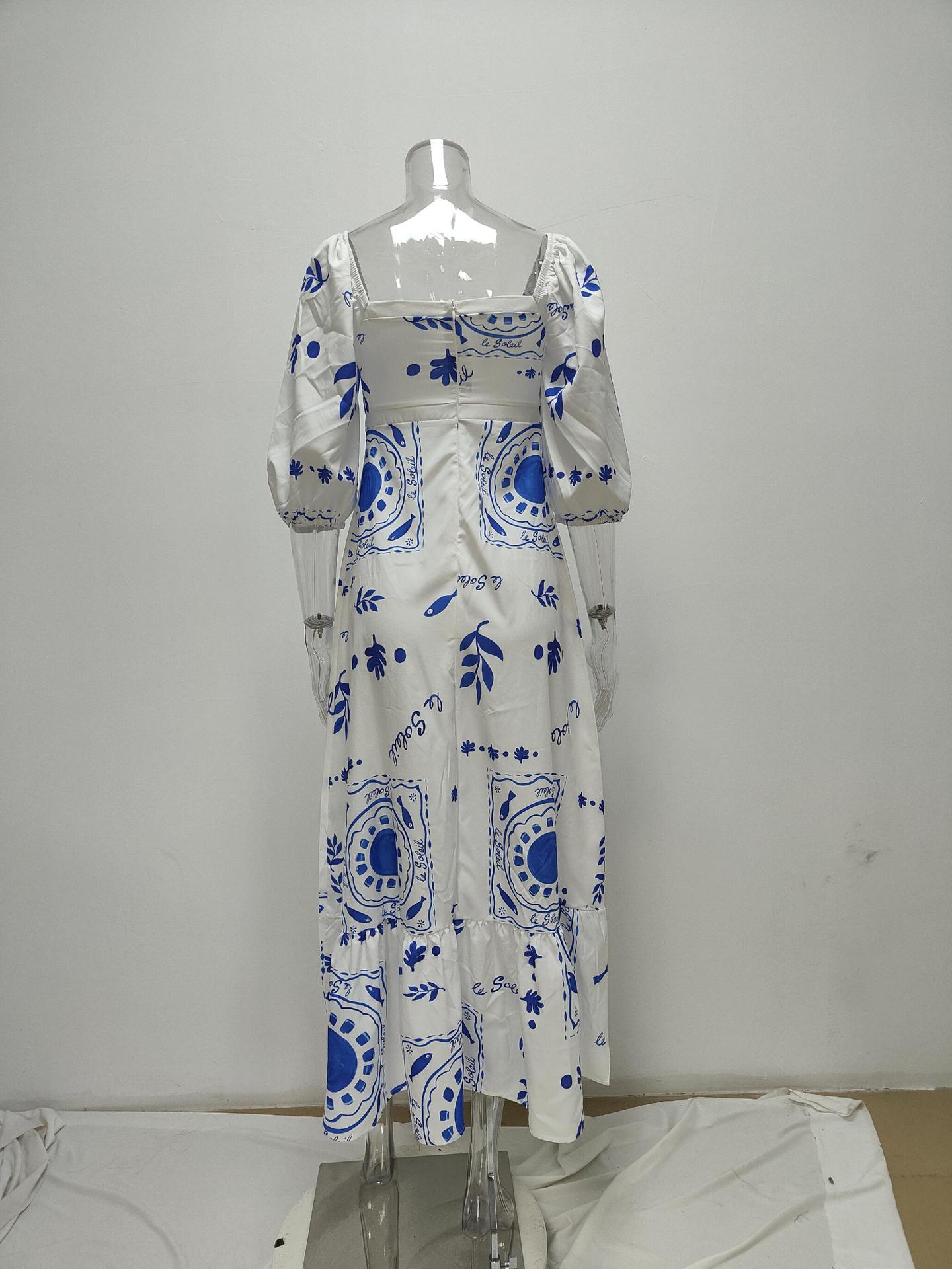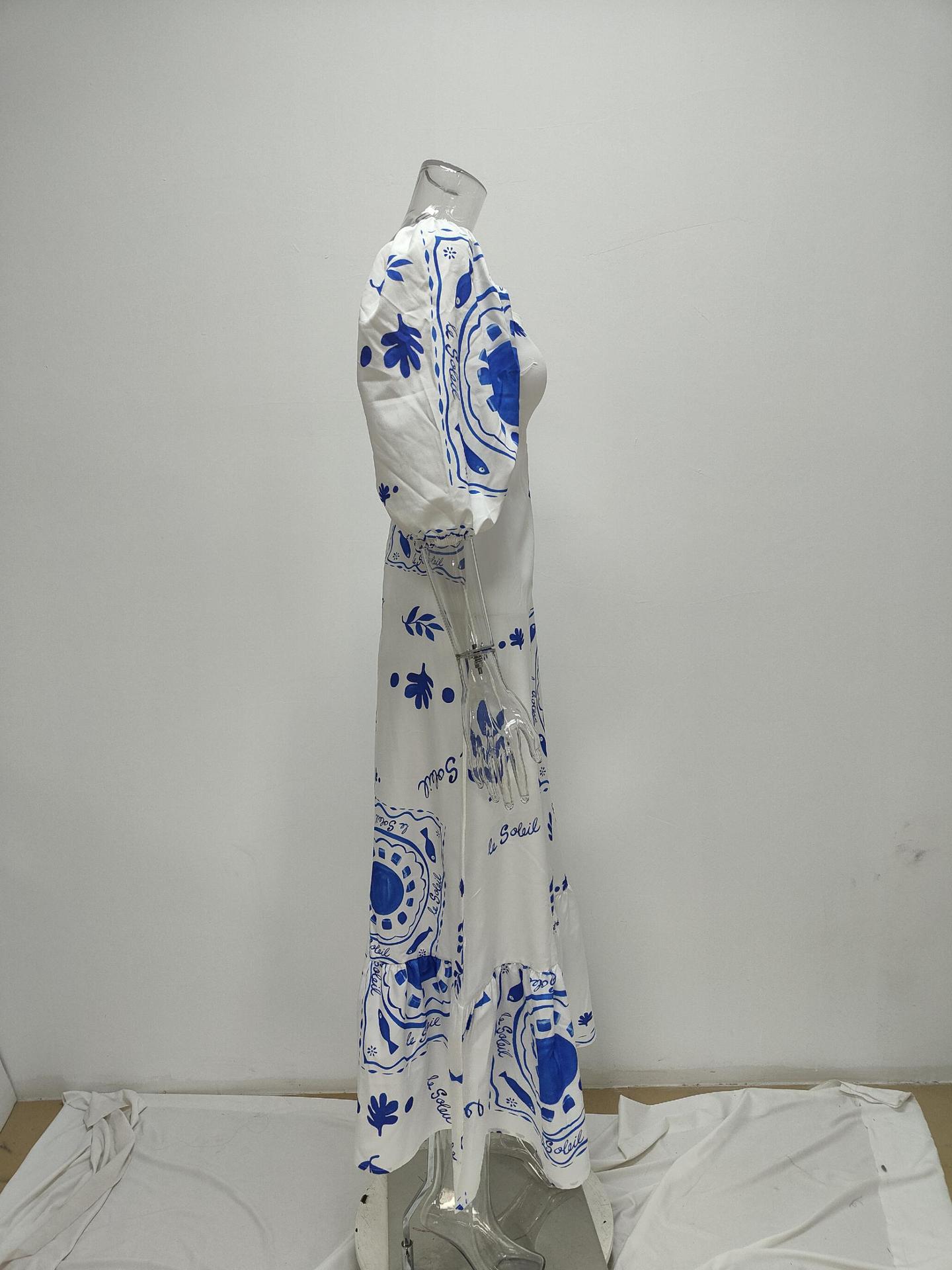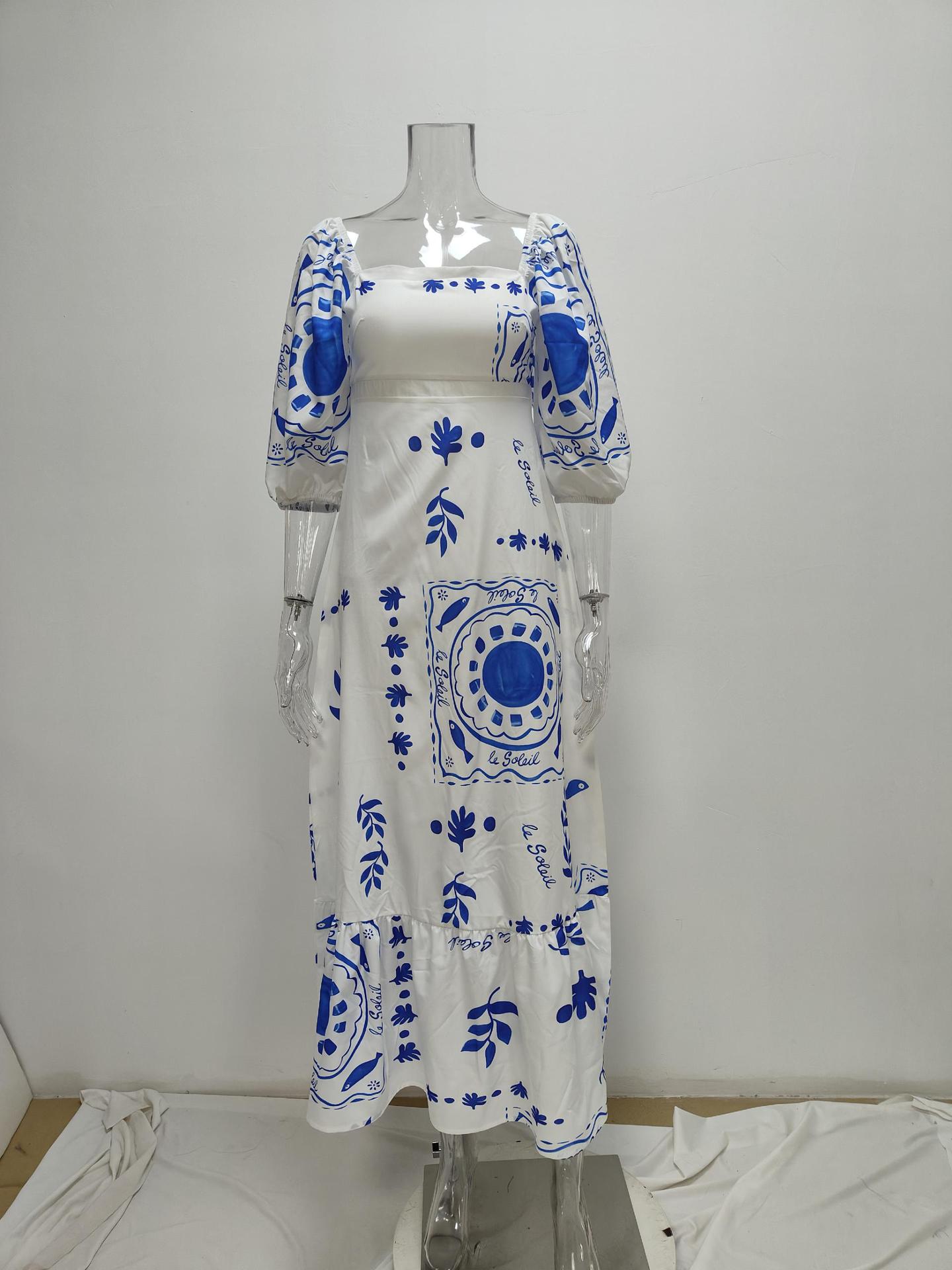 women's elegant and fashionable printed lantern short sleeve A-line big swing dress